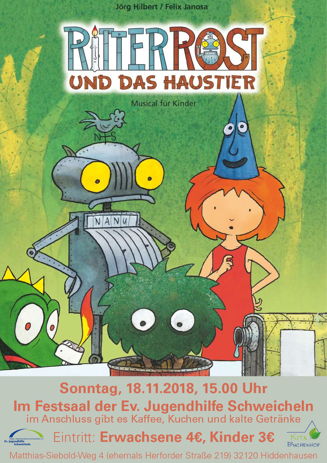 Die Kita Buchenhof lädt am Sonntag, 18. November 2018 um 15 Uhr, Kinder ab 4 Jahren und ihre Eltern zur musikalischen Lesung mit Patricia Prawitt ein. Zum mittlerweile dritten Mal besucht die Originalstimme des Burgfräulen Bö die Ev. Jugendhilfe Schweicheln und hat das Stück "Ritter Rost und das Haustier" im Gepäck