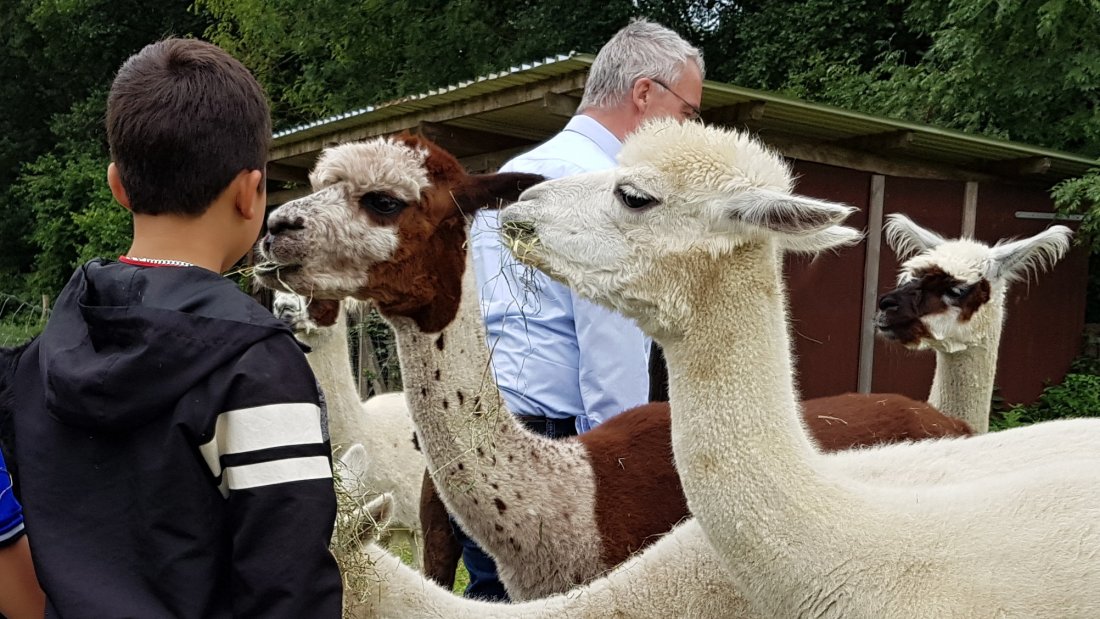 „Alpakas sind ruhige und freundlich-distanzierte Tiere“, erklärte Tagesgruppen-Mitarbeiter Oliver Nordsiek beim Besuch am vergangenen Dienstag. „Gleichzeitig sind sie aber sehr neugierig, was sie zu guten Partnern im Erlernen von sozialem Regelverhalten macht.“ Sein Kollege Christian Stork ergänzte: „Deshalb haben wir uns sehr gefreut, als die Osthushenrich-Stiftung uns ihre Unterstützung in diesem tollen Projekt zugesagt hat.“ Burghard Lehmann, Geschäftsführer der Stiftung, machte sich selbst ein Bild von dem tiergestützten Angebot. „Die Unterstützung von Kindern und Jugendlichen aus Ostwestfalen-Lippe ist für uns eine Herzensangelegenheit“, sagte Lehmann. „Deshalb sind wir bei dieser tollen Idee gerne als Projektpartner eingestiegen.“