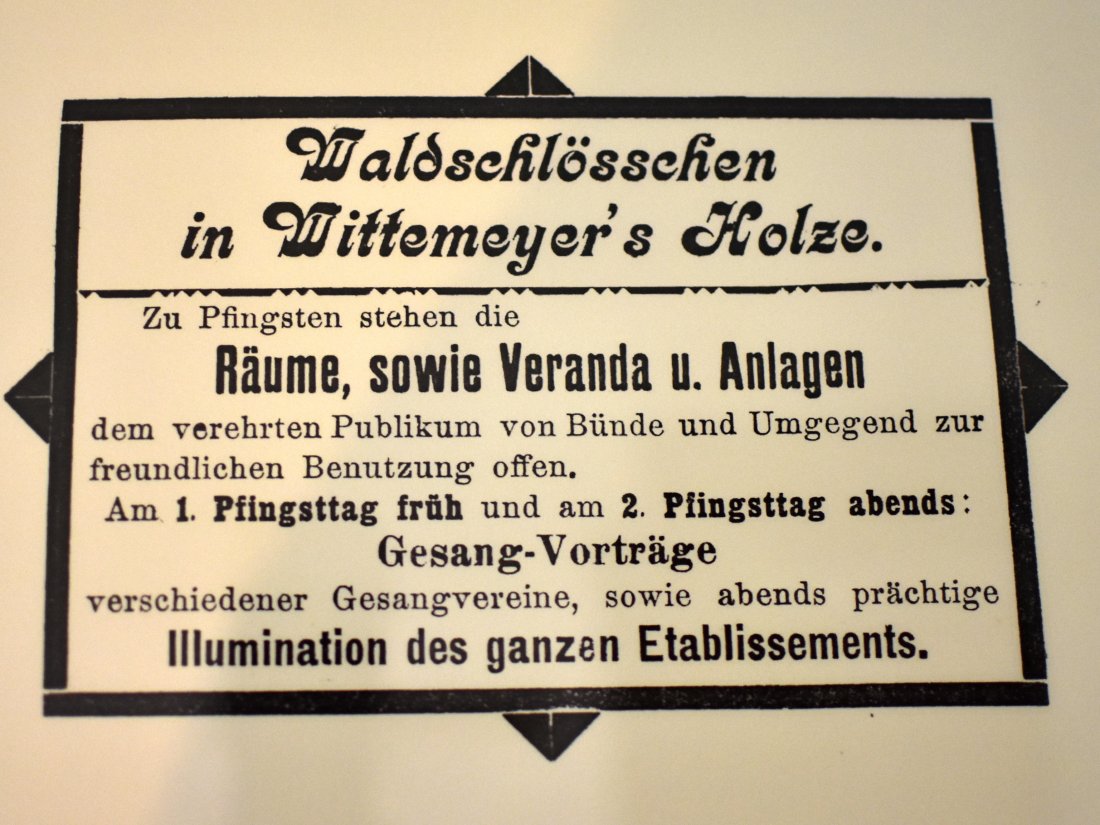 Möglich machte das ein Zufallsfund: Im Archiv stieß Jörg Militzer auf eine Zeitungsmeldung. „Wittemeyers Holz war für die Bünder von jeher ein beliebter Ausflugsort. In Zukunft wird dies noch mehr als bisher der Fall sein“, heißt es dort, „denn fehlte bis dahin noch ein Plätzchen zum Ausruhen und zum Erquicken, so ist dem Mangel nun durch ein mit allem Komfort der Neuzeit ausgestattetes Restaurant ausgeholfen.“ Veröffentlicht wurde diese Meldung am 17. Mai 1902. In einer zusätzlichen geschalteten Anzeige wurde der Eröffnungstag dann mit dem darauffolgenden Pfingstsonntag, also dem 18. Angegeben, wie Jörg Militzer weiter herausfand. Bekannt ist er vor allem als Experte für Orts- und Regionalgeschichte und als Bünder Stadtführer.
