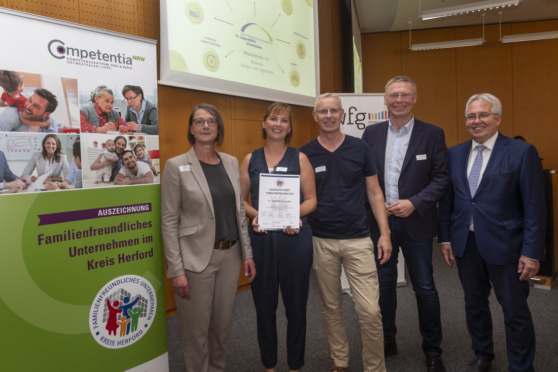 Übrigens: Ganz viele der ebenfalls ausgezeichneten Unternehmen nutzen unser Servicetelefon für Vereinbarkeit von Familie und Beruf. Eva Leschinski (Kompetenzzentrum Frau und Beruf, von links) überreicht die Urkunde an unsere Kolleg:innen Nadine Rohr und Bertram Schwade. Mit dabei: Hiddenhauses Bürgermeister Andreas Hüffmann sowie Landrat Jürgen Müller.